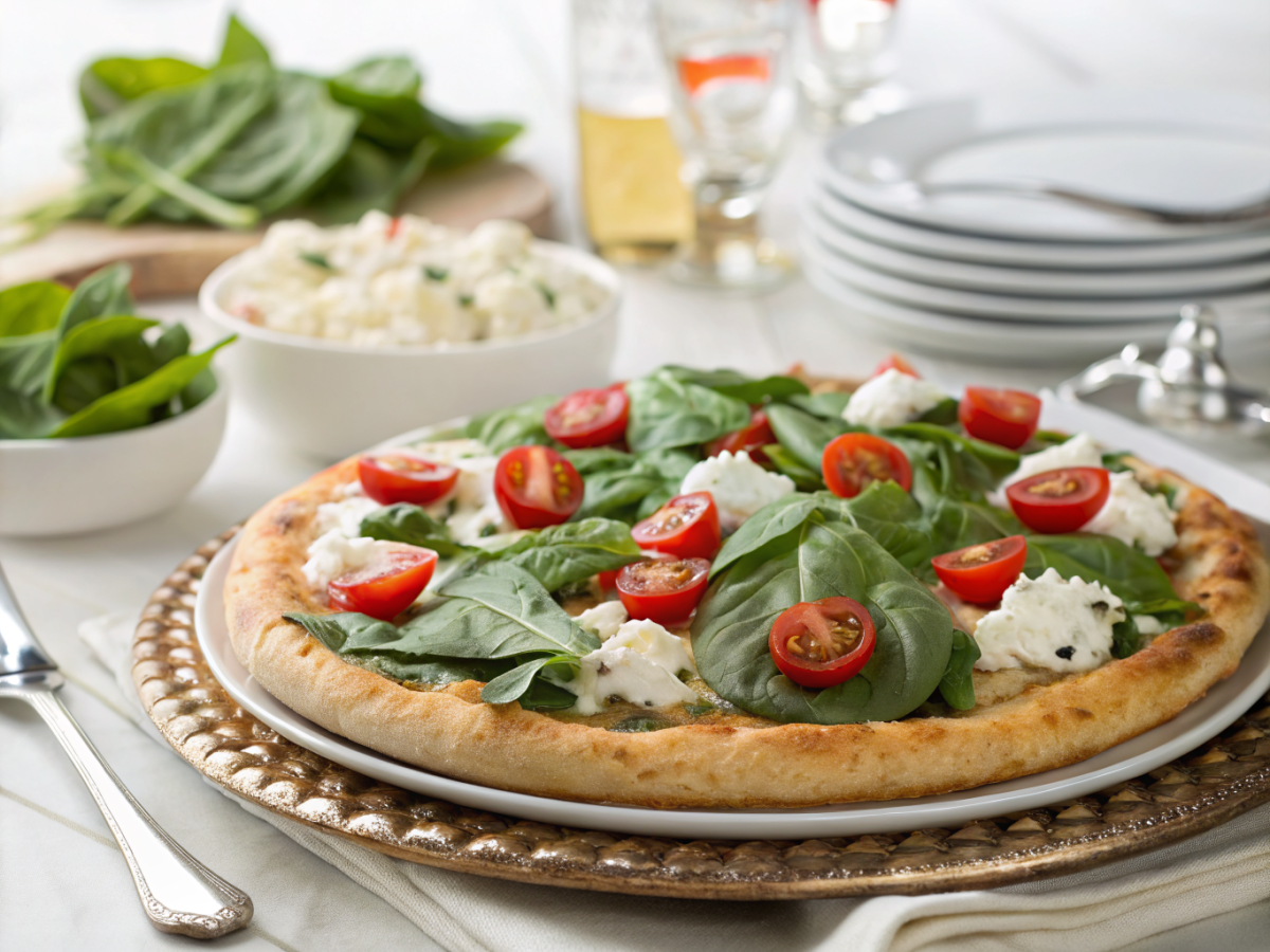 A delicious and protein-packed pizza featuring creamy cottage cheese, fresh spinach, and juicy tomatoes on a crispy crust.