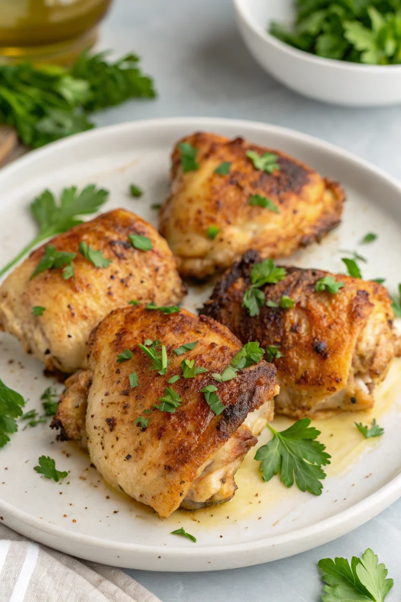A1: Absolutely! Boneless, skinless chicken thighs work well for this recipe. However, the cooking time will be slightly shorter (about 15-20 minutes in the oven), and you might miss out on the crispy skin and some of the inherent fat that makes bone-in, skin-on thighs so flavorful. Consider adding a little extra butter or olive oil to compensate for the lost fat.