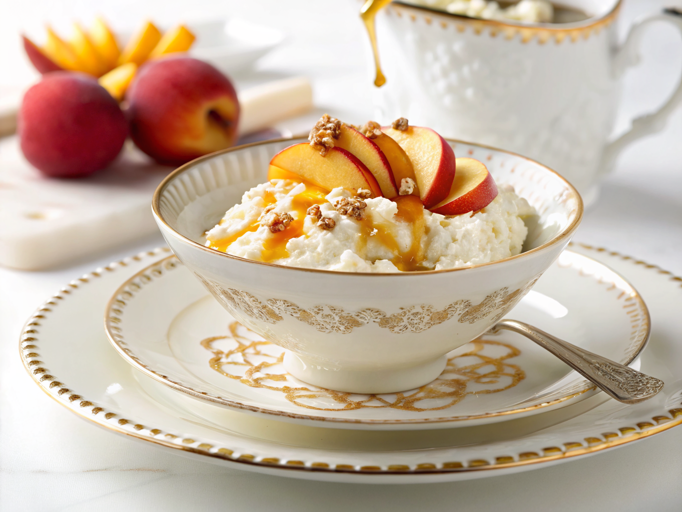 Hot, Honey, Cottage, Cheese — Hot Honey Cottage Cheese Bowl: cottage cheese beautifully presented. Food blogger style photography, top-down angle, marble surface background. High quality, detailed, mouth-watering composition.