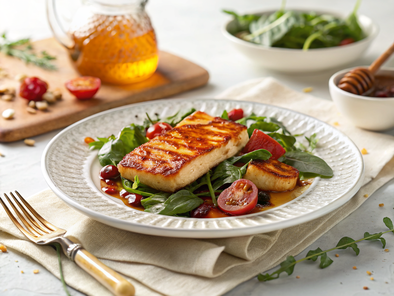 For a complete meal, serve your Hot Honey Halloumi over a bed of mixed greens with cherry tomatoes, cucumber, and red onion. The warm cheese slightly wilts the greens while the hot honey serves as a built-in dressing. Add quinoa or couscous to make it more substantial, creating a balanced meal that satisfies without feeling heavy.