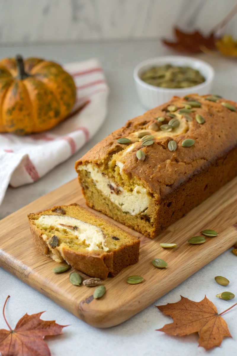 Serve slices of warm Pumpkin Cream Cheese Bread with a sprinkle of toasted pecans or a dusting of extra cinnamon. For an elevated breakfast or dessert, accompany a slice with a dollop of whipped cream or a scoop of vanilla bean ice cream. A visual tip for food styling: arrange slices on a rustic wooden board, garnished with a few whole cinnamon sticks and scattered pumpkin seeds to highlight the autumnal theme.